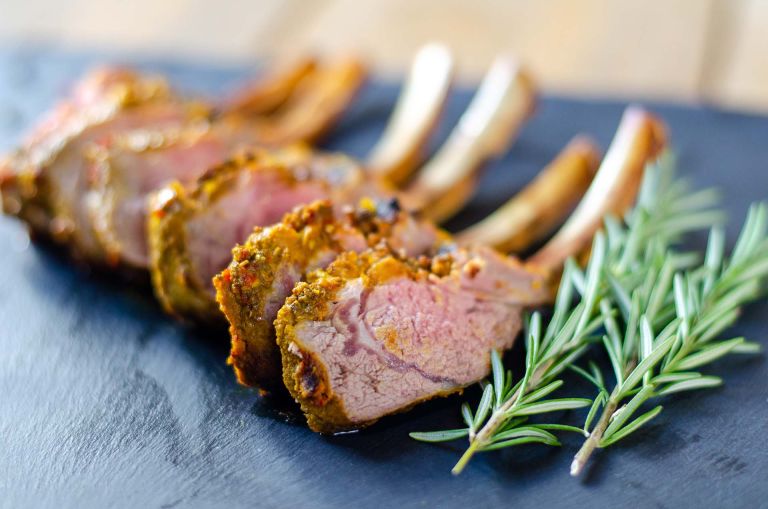 - Verhit een pan (zonder olie/boter) en bak hierin de lamsrack om en om.